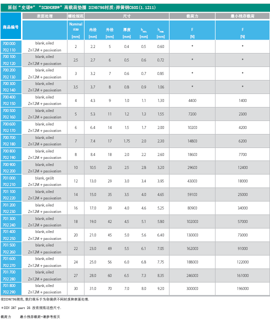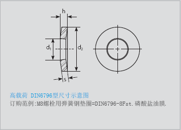 適用于8.8~12.9高強度螺栓.外形同碟形彈簧,壓平時墊圈載荷為螺栓載荷70-90%.設計規(guī)范遵循DIN6796 1987.Oct.版鎖緊載荷隨墊圈愈平愈高,壓平時實際載荷為計算值2倍.為了維持螺栓預緊力,出廠前全載荷(定型)壓平數(shù)次.因此,第二次使用同一墊圈時,即使高度為hmin螺栓仍有相同鎖緊載荷,高度不會再變化.
