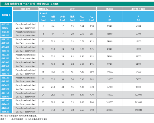 尺寸設(shè)計(jì)依DIN6796規(guī)范,但外徑比較小,因此外形呈弧狀.載荷曲線為漸進(jìn)上拋物線.外徑雖小,載荷同高載荷DIN6796墊圈.用于空間比較小處.